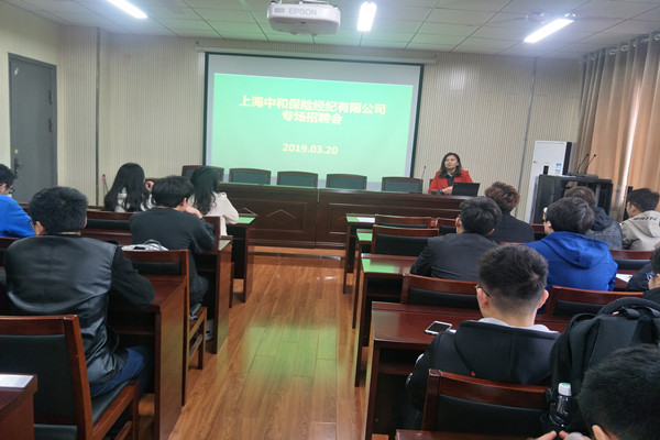 3月21日下,上海中和保险经纪有限公司综合管理部总经理李昊一行2人,来我院举办毕业生招聘专场宣讲会,招聘会在宁远楼A410报告厅举行,毕业班辅导员和近60名学生参加。