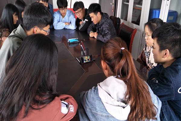 同学们在党员活动室收看大会直播