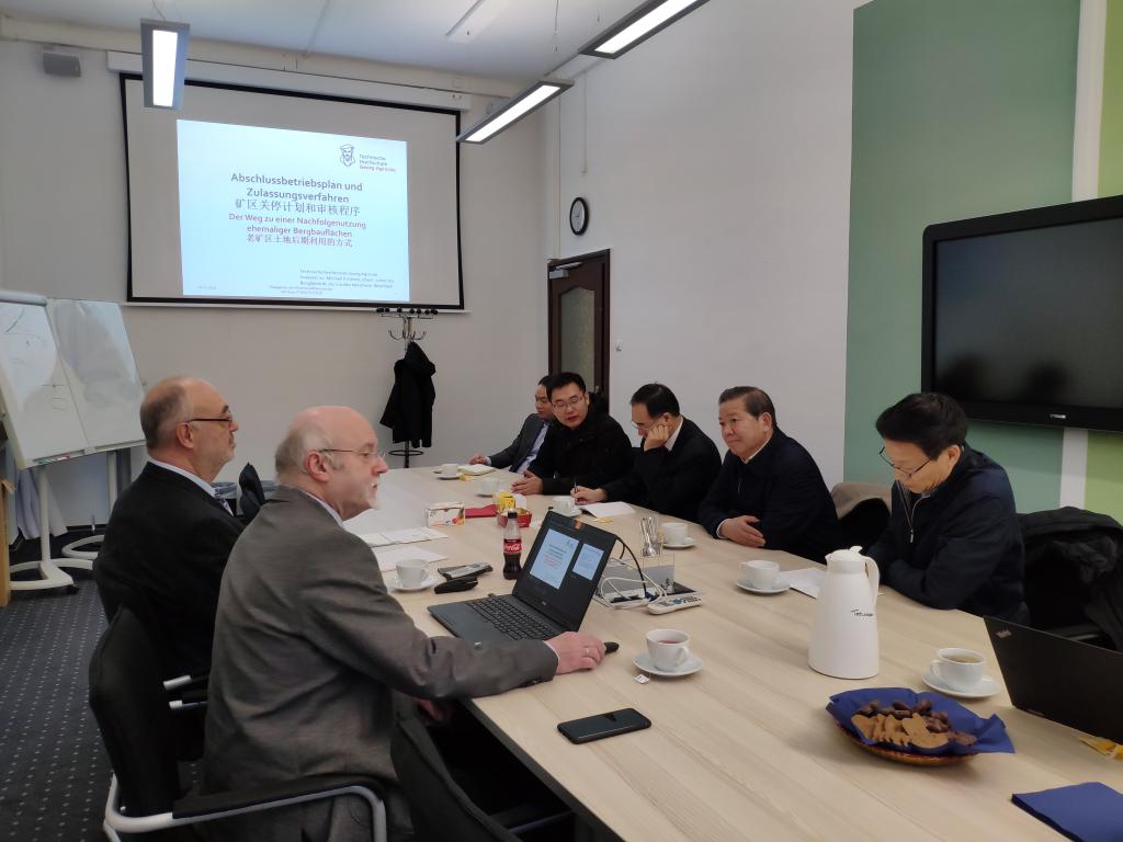 调研德国波鸿工业大学期间,与原北威州煤炭局局长Michael Kirchner教授、Frank Otto教授等进行了座谈交流,Michael教授介绍了德国矿区关停计划和审核程序、老矿区土地后期利用情况。Frank教授介绍了矿区生态修复领域最新研究进展,并分析了关停矿井管理模式、矿井资源再利用的政企关系等问题。