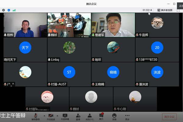 此次线上答辩采用腾讯会议网络平台。答辩委员会主席安徽大学程桦教授、中国矿业大学林柏泉教授和答辩委员安徽理工大学刘泽功教授、石必明教授、袁树杰教授、戴广龙教授均通过网络视频方式参会。答辩人在家或工作室通过网络进行在线答辩。