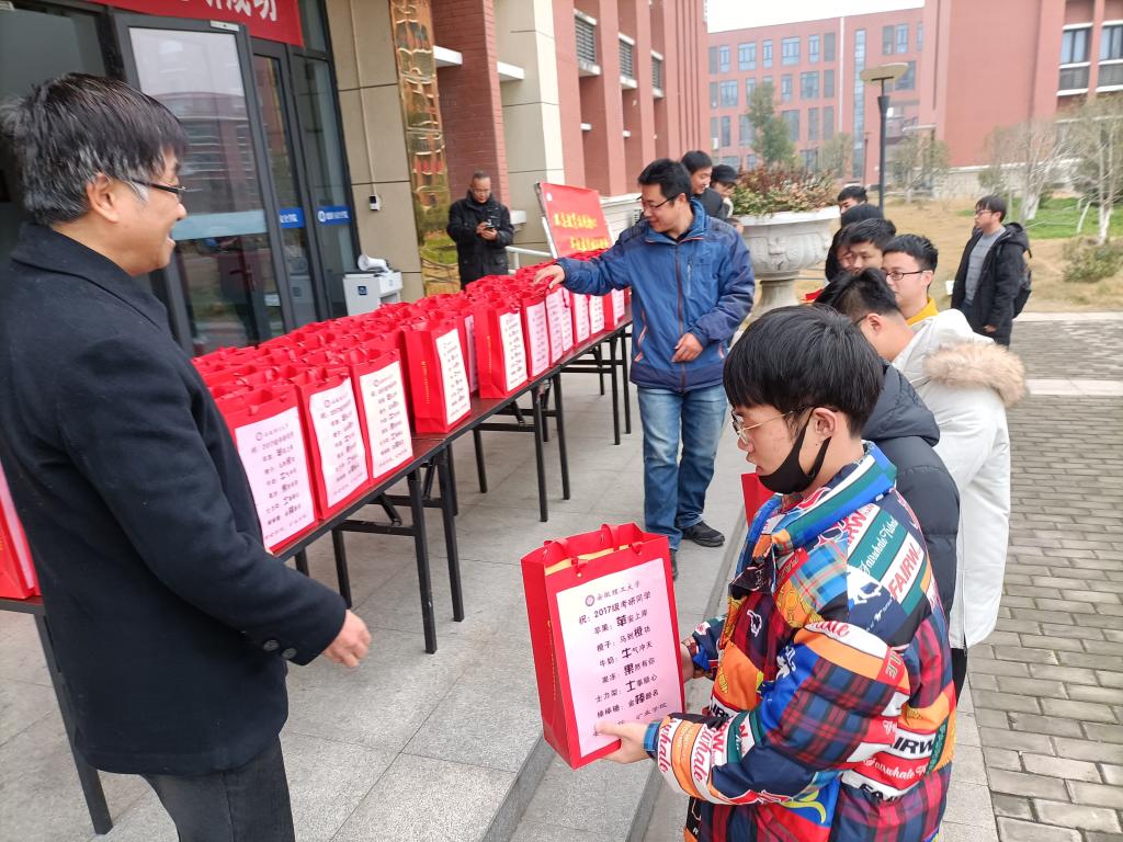 活动最后,参加活动的领导老师为每一位考研同学送上了学院精心准备的“考研大礼包”,里面有苹果、橙子、牛奶、士力架、果冻、棒棒糖,寓意着“苹”安上岸、马到“橙”功、“牛”气冲天、“果”然有你、“士”事顺心、金“棒”题名。活动在一片温情中圆满结束。
