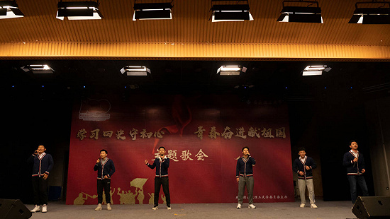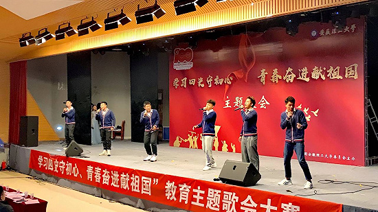 2021年3月26日晚,由安徽理工大学校团委主办的“学习四史守初心,青春奋进献祖国”主题歌会于钻石剧场拉开序幕。由徐树炜、张耀元、何占琦等六名同学所组成的合唱组合,在十七个学院选手的激烈角逐中脱颖而出,荣获一等奖的好成绩!