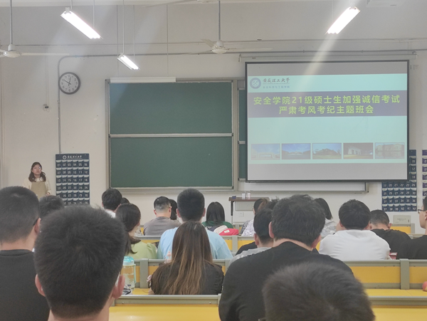 为了增强学生的诚信意识,营造学生诚信考试、公平考试的学习氛围,端正考风、严肃考纪,安全学院于2022年6月13日在明理北108教室召开了“加强诚信教育-严肃考风考纪”主题教育大会,会议由安全学院研究生辅导员申晓静老师主持,2021级全体硕士研究生参加了会议。