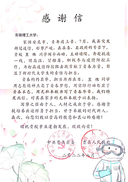 近日,中共曹县县委、曹县人民政府致信学校,对安全科学与工程学院安全工程专业硕士研究生王伟同学闻令而动,主动请缨,奔赴抗疫一线,顶高温、冒酷暑,积极参与疫情防控工作提出表扬,对学校时代新人培养致以崇高的敬意和衷心的感谢!