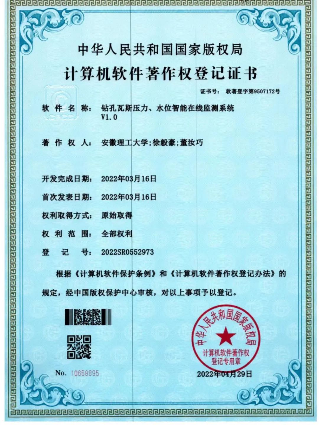在大学四年里,徐毅豪获得一项实用新型专利,应用于开展超细水雾对可燃气体爆炸性的抑制密闭腔体实验时,形成更好的细水雾环境,以更好的指导实际。在此过程中,严灼老师给了徐毅豪很多具有指导性的意见,引导徐毅豪自主创新,并支持他申报大创项目立项进一步研究。而徐毅豪另一项软件著作,则是采用Matlab的GUI功能编写,实现了测压钻孔内瓦斯压力实时分析,瓦斯水位监测的功能。