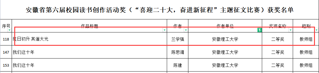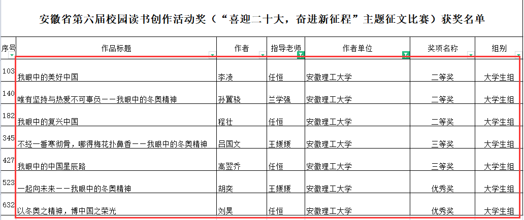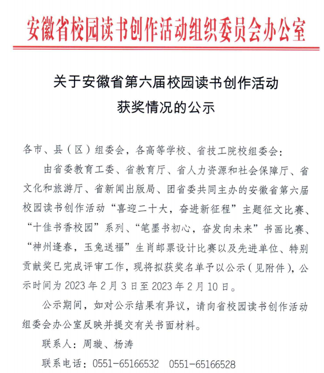 近日,由安徽省委教育工委、省教育厅、省人力资源和社会保障厅、省文化和旅游厅、省新闻出版局、团省委共同主办的安徽省第六届校园读书创作活动评审结果揭晓,我院累计获奖9项。其中,二等奖5项,三等奖2项,优秀奖2项。