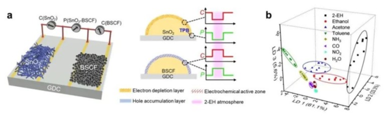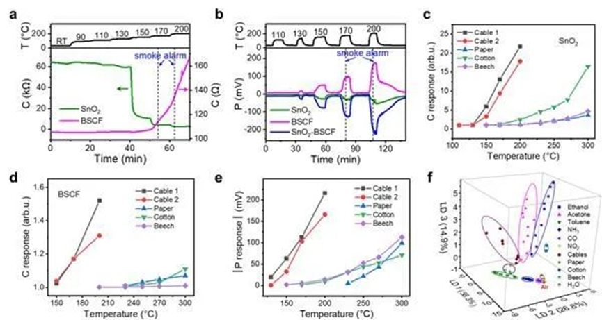研究人员首先利用半导体氧化物电极在表面和界面上不同的响应机制,在同一电极上成功提取出化学电阻和电位两种不同原理的传感信号;进一步,采用钙钛矿型氧离子-电子混合导体氧化物取代贵金属铂电极,和常规的电子导电的敏感材料进行配对,获得了输出三个独立响应信号的双敏感电极传感器。得益于钙钛矿非常规的反向电位响应,传感器的气敏性能得到了显著提高,实现了2-乙基己醇、一氧化碳等多种危险和火灾特征气体的(亚)ppm级三维探测和准确识别,并展现出在火灾危险早期预警方面的应用潜力。