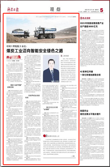 9月4日,《科技日报》院士访谈栏目近整版报道了袁亮院士带领科研团队开展煤矿智能精准开采和甲烷防控减排等科技攻关的故事。