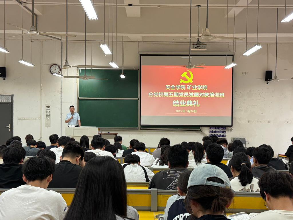 5月20日晚,安全科学与工程学院、矿业工程学院分党校第五期党员发展对象培训班结业仪式在明理105教室举行。矿业工程学院党委副书记、分党校副校长田秋实出席仪式,两学院辅导员及161名学员参加结业仪式。