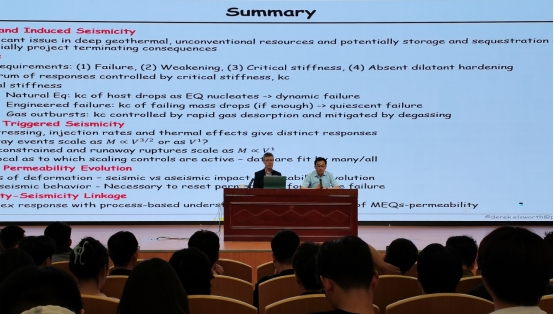 Elsworth院士的报告基于全球能源发展现状,重点关注化石能源开采过程中的地震风险。他系统介绍了评估断层滑动稳定性的理论模型与实验室模拟方法,深入解析了地下资源开发(尤其是煤层开采)过程中,流体活动引发地震、岩爆及瓦斯突出等复杂动力学现象的机制。报告中,Elsworth院士还分享了其团队在现场尺度研究中的最新成果,揭示了地震活动与地层渗透性之间的内在关联及其相互作用机制。他特别指出,机器学习技术在刻画和预测地震演化路径方面展现出巨大的潜力。