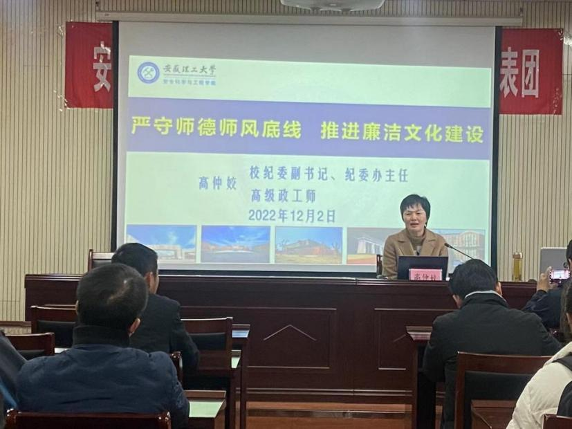 12月2日下午,安全科学与工程学院邀请校纪委副书记、纪委办主任高仲姣,在宁远楼A410报告厅为学院党员教育培训班作师德师风与廉洁文化教育专题报告。报告会由学院党委书记金德主持。