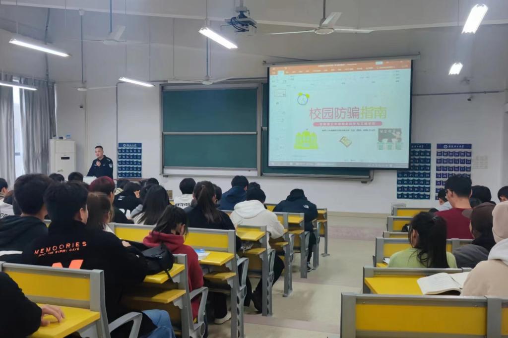 为加强平安校园建设,强化同学们的安全意识,11月23日下午,应安全学院邀请,淮南市公安局山南分局情报指挥中心主任冯青松和我校保卫科科长李虎受邀在明理北楼开展防电信网络诈骗和校园交通安全教育主题讲座。各年级学生代表200余人聆听讲座。