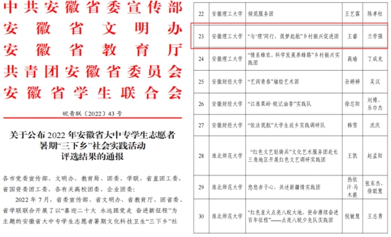 近日,由团省委学校部开展的“2022年安徽省大中专学生志愿者暑期‘三下乡’社会实践活动相关评奖评优活动”结果出炉,经过资格审查、专家评选、结果复审等环节,我院“与‘理’同行,筑梦起航”乡村振兴促进团获评2022年全省大中专学生志愿者暑期“三下乡”社会实践活动优秀实践团队。