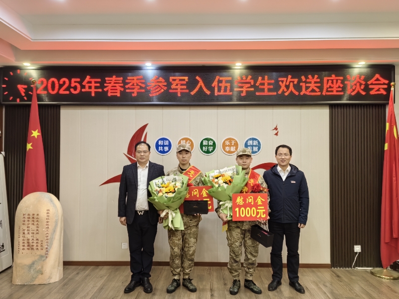 学院党委书记金德对经过层层选拔、即将入伍的两位预定新兵表示热烈祝贺,对他们投笔从戎、保家卫国的崇高精神表示赞赏,同时提出三点期望:一是始终牢记“听党指挥、能打胜仗、作风优良”的强军目标,坚定理想信念,严守纪律,忠诚于党、忠诚于人民、忠诚于祖国,做一名政治上绝对合格的战士。二是发扬不怕苦、不怕累的精神,刻苦训练,锤炼能打胜仗的过硬本领,不断提升自己的军事素质和综合能力;三是继续秉承“团结、奋进、博学、奉献”的校训,弘扬“志存高远、追求卓越、求真务实”的校园精神,保持艰苦奋斗、求真务实的优良传统,在军队的大舞台上施展才华,在军营的大熔炉里淬炼成钢。