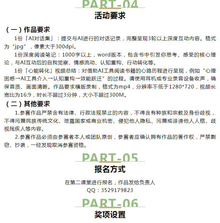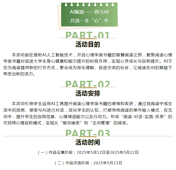 5月12日,安全学院在学院公号发布了《AI赋能——我与AI共读一本“心”书》活动,此活动通过借助AI人工智能技术,开启心理学类书籍的智慧阅读之旅,聚焦阅读心理学类书籍对促进大学生身心健康和能力提升的积极作用,实现心灵成长与自我提升。