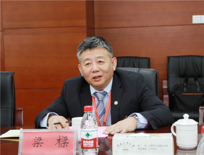 梁樑讲话。他强调此次双方共建研究中心开启了两校深度合作的第一步,对两校的学科专业发展具有里程碑的意义。安徽理工大学在安全、地矿、爆破等学科方面特色鲜明,在煤炭开采及瓦斯治理领域形成了丰硕的研究成果和突出业绩,行业内影响力大。工大在智能制造及工程管理方面有着深厚的积累,两校工科优势明显。解决国家重大战略需求,离不开产学研合作和基础研究,要充分发挥高校在基础研究、基础应用研究优势,希望校企双方共同努力,把中心打造成国内乃至国际一流中心,为国家智能制造和灾害防控研究及应用贡献力量。