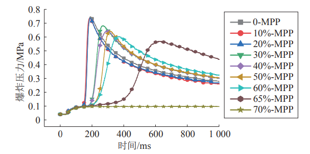 图4 添加不同质量分数MPP的聚丙烯爆炸压力-时间进程图