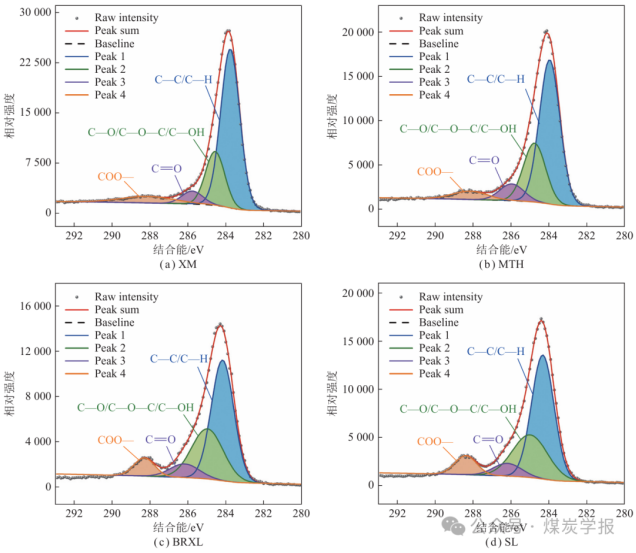 图9 4组煤样的C 1s电子能谱分峰拟合示意
