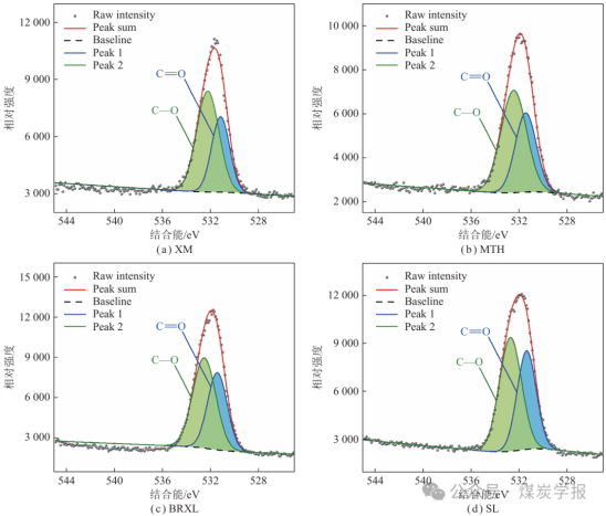 图10 4组不同煤种原煤煤样的O 1s电子能谱分峰拟合示意