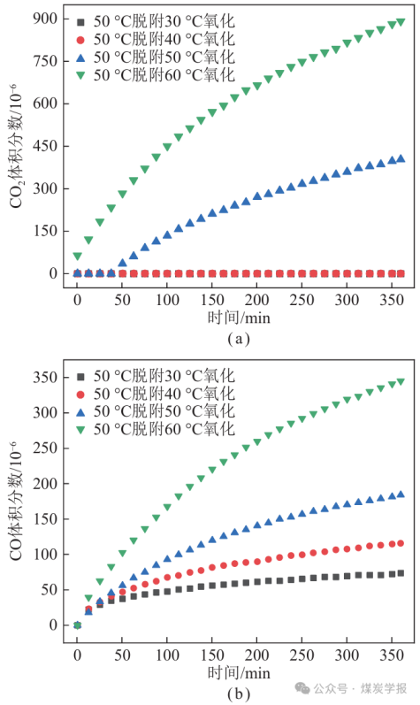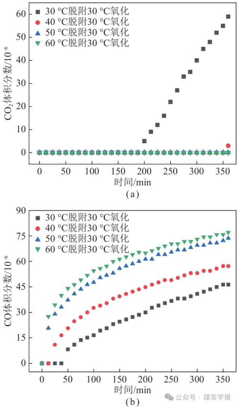 同时借助循环氧化在线监测技术,设计实施不同因素(煤种、脱附温度、氧化温度、粒径)条件下脱附后煤样的常温氧化实验,并结合相应的低温氮吸附、XPS、ESR实验分析反应机理。循环条件下的常温氧化实验表明,真空脱附后的煤体在常温氧化过程中会形成大量的CO和CO2等气体氧化产物,且气体在通入氧气后很快出现并不断积累,证明煤在常温下即可发生氧化反应。