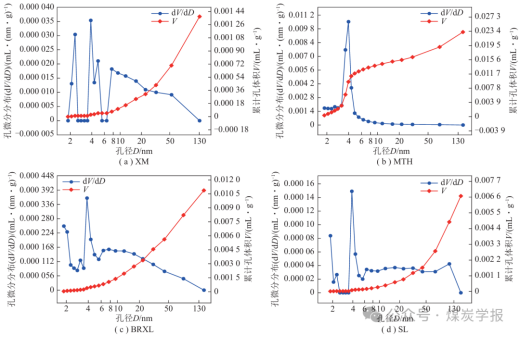 图7 4组不同煤种煤样BJH孔径分布和累计孔体积曲线