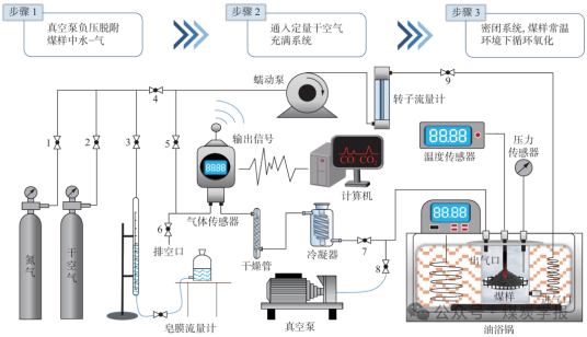 (1)利用真空脱附和循环氧化的方法,将煤中水分和气体脱附出来,增加煤中活性结构的暴露量并研究其在常温条件下的氧化行为。
