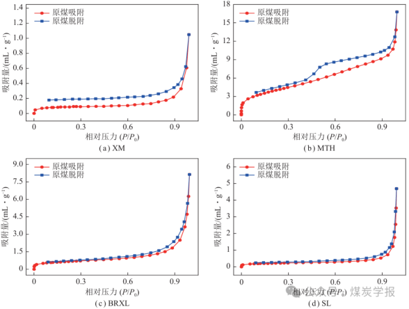 图6 4组不同煤种煤样低温氮气吸脱附曲线