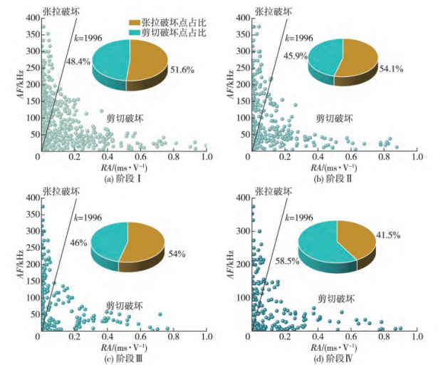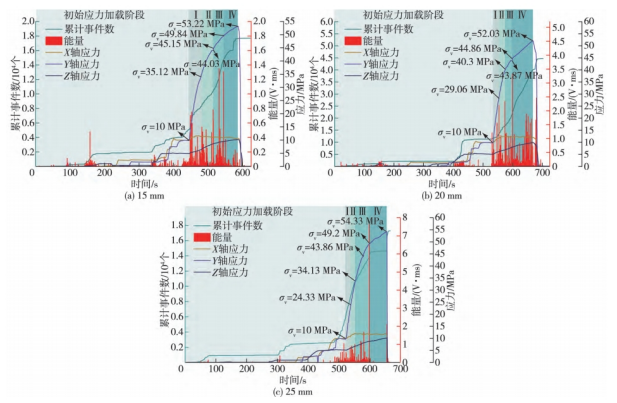 (2)根据声发射累计事件数和能量变化,试样破坏过程可分为:裂纹萌生、裂纹稳定扩展、裂纹非稳定扩展和裂纹贯通等4个阶段。声发射信号在裂纹萌生阶段开始活跃,在裂纹稳定扩展阶段持续活跃,在裂纹非稳定扩展阶段急剧增加并达到能量峰值,在裂纹贯通阶段明显减弱。试样破坏过程中声发射峰值能量随孔径增大而增大。