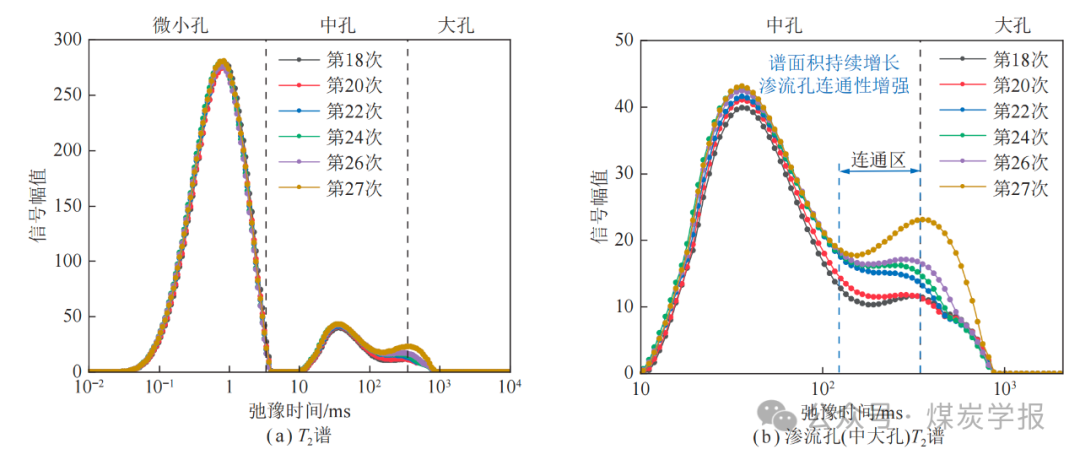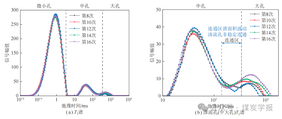 图 11 裂隙连通阶段煤样 T2 谱演化曲线