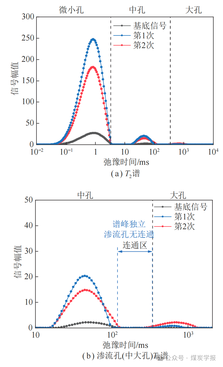 核磁共振(NMR)是一种精度高(可检测最小孔径达0.1 nm)、无损的孔隙结构测试技术,可用于分析煤岩体孔裂隙结构的演化特征。赵洪宝等对煤体进行落锤试验,借助核磁共振分析仪获得了冲击前后煤体的