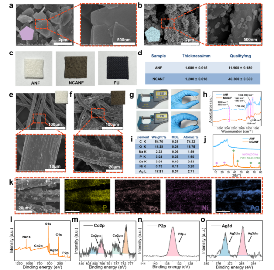 图2材料的物相、微观结构及表面元素分析。(a) M(OH)(OCH3)与(b) AgNP@PDA@M(OH)(OCH3)(M=Co, Ni)的SEM图像;(c) ANF、NCANF及FU的数码照片;(d) ANF与NCANF的物理参数;(e) ANF的SEM图像;(f) NCANF的SEM图像;(g) ANF和NCANF厚度数据;(h) ANF与NCANF的红外光谱;(i) NCANF的表面元素组成(EDS);(j) ANF与NCANF的XRD图谱;(k) NCANF的SEM图像及其表面元素分布。XPS谱图:(l)全谱,(m) Co2p谱,(n) P2p谱,(o)