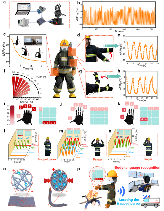 图6 NCANF在智能消防服应用中的动作行为识别性能。(a)电阻变化测量系统示意图;(b) NCANF集成于指关节处反复弯曲运动的电阻变化率;(c) NCANF集成于指关节处弯曲单次记录的电阻变化率;NCANF集成于肩部,(d)肩部的运动照片及(e)对应电阻变化率记录;(f)指关节弯曲角度与电阻变化率的梯度对应关系;NCANF集成于肘部,(g)肘部的运动照片及(h)对应电阻变化率记录;消防手语:(i,l)"发现被困人员"、(j,m)"危险"、(k,n)"收到";(o) NCANF压敏特性作用机制;(p) NCANF在智能消防服中的动作行为识别性能的应用场景。