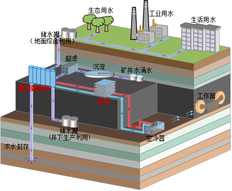 热泵驱动的井下原位制冷与膜蒸馏水处理系统运行示意图