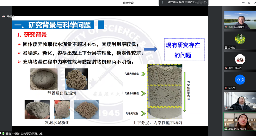 来自于湖南科技大学、山东科技大学、中国矿业大学、郑州大学、重庆科技学院、南京工业大学、安徽理工大学等7所高校的10位开放课题负责人依次进行了汇报,分别就课题研究背景和科学问题、研究内容与研究目标、研究方案与实验手段、考核指标与研究进度等四个方面进行阐述,并明确了来我校拟开展学术报告的时间和内容。