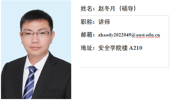 赵冬月(1989.11-),男,汉族,湖北襄阳人,中共党员,博士,讲师,硕导。现任安徽理工大学安全科学与工程学院讲师。主要从事城市公共安全与应急管理方面的研究工作。